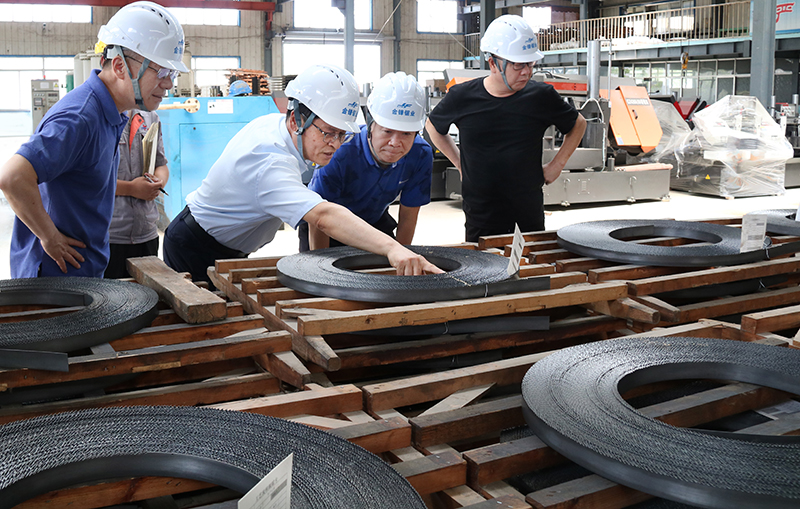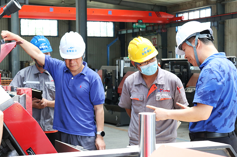 在公司第一會議室,金鋒鋸業總經理劉慶春、總工郭傳鑫和技術研發團隊向三位教授匯報了公司帶鋸床、帶鋸條研發生產情況,并詳細介紹了世界鋸切行業前沿技術與產業動態。雙方就智能高速鋸切新技術及鋸床產業升級話題展開了如火如荼的研討。教授們抓住帶鋸床帶鋸條鋸切材料性質、進給模式、負載數據傳導、齒形齒角、震動抑制等具體鋸切難題給予了詳細分析和指導。隨后,他們深入到生產裝配一線,細心查看,精心指點,知無不言,言無不盡,盡顯專家風范。