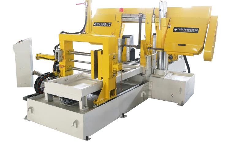 以我司為客戶定制打造的龍門式GS500雙鉗雙壓、前后送料1.2m數(shù)控帶鋸床舉例,如上圖所示,此鋸床采用了兩組自動(dòng)送料裝置(進(jìn)料、出料側(cè)各一組),進(jìn)料側(cè)虎鉗夾緊向前送料,單次最大行程為1.2m,如不能滿足所需長(zhǎng)度,則由出料側(cè)送料機(jī)構(gòu)夾緊工件往前拉料,單次型材為1.2m,輥輪為自由輥道,送料機(jī)構(gòu)由液壓驅(qū)動(dòng),長(zhǎng)度采用光柵尺檢測(cè),可以多次重復(fù)送料。在鋸床的送料虎鉗座后方安裝光幕開關(guān),可檢測(cè)送料,在檢測(cè)不到材料時(shí)說(shuō)明需要重新上料,觸摸屏上顯示無(wú)料。此定制鋸床的鋸架根據(jù)客戶需求特殊設(shè)計(jì),鋸輪左右輪傾斜2-3°,滿足客戶對(duì)型鋼類材料的鋸切需求,防止型鋼卡鋸,客戶對(duì)此鋸床的使用體驗(yàn)給與了優(yōu)異反饋。