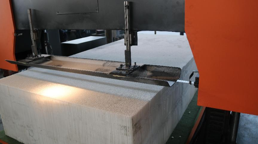 泡沫鋁是超輕純金屬材料,主要在于打造鋸床合適的鋸切范圍、靈活的工作臺、合理的固定裝置以及為客戶設(shè)計正確的鋸床切割參數(shù),使帶鋸床達(dá)到穩(wěn)定的鋸切效果,保障不對材料切割表面造成損耗。客戶所需切割的發(fā)泡鋁面積大,而對承重要求不高,因此適合使用具有高承載面積的數(shù)控臥式結(jié)構(gòu)帶鋸床。