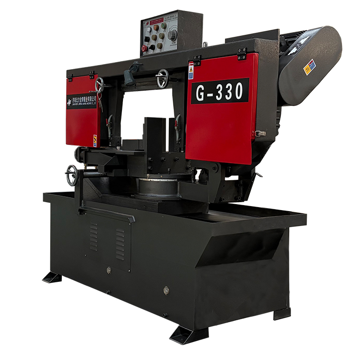 G330角度鋸床作為旋轉角度帶鋸床的代表,一直備受國外客戶青睞。鋸床為剪切式結構,引進和吸收國外同類鋸床的性能特點,配備液壓平衡油缸,高強度平衡彈簧及液壓無極調速系統(tǒng)。在鋸切時,鋸架可正向旋轉0°—45°或反向旋轉0°—60°,適應鋸切有角度要求的角鋼、圓鋼、矩形管等。