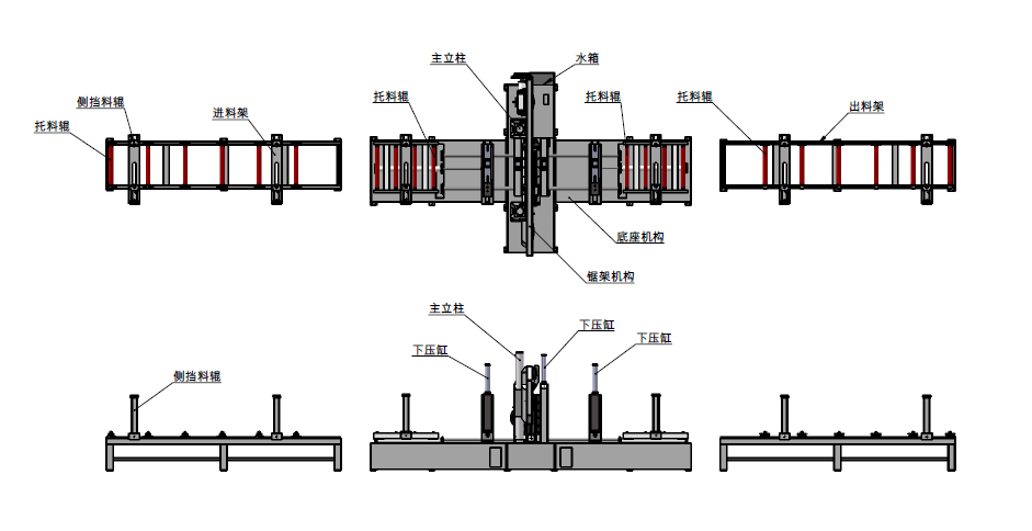 (6)鋸條前后各一套送料床臺,后床臺送到位后,如果還不到設定尺寸,再由前床臺往前拉,如果還不夠接著再由后床臺往前送,如此循環,直至送夠所需長度開始鋸切。